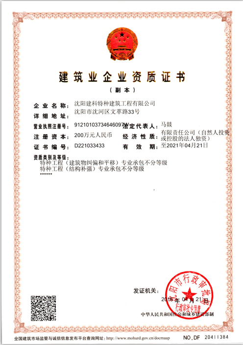 2002年以來,公司主要承擔的工程有:沈陽中興商業(yè)大廈加固工程、陸軍總院改造加固工程、興業(yè)銀行加固工程、鐵西消防大隊改造加固工程、茂業(yè)百貨改造加固工程、懷遠門賓館改造加固工程、骨科醫(yī)院改造加固工程、沈陽市人力資源和社會保障局辦公樓加固工程、沈陽華利大廈加固工程、沈陽合作銀行改造加固工程、環(huán)保大廈加固工程、東北國際醫(yī)院改造加固工程、天時酒店改造外墻保溫加固工程、海城市疾病預防控制中心維修改造工程、金利來商廈的大型公建的加固改造工程等等。